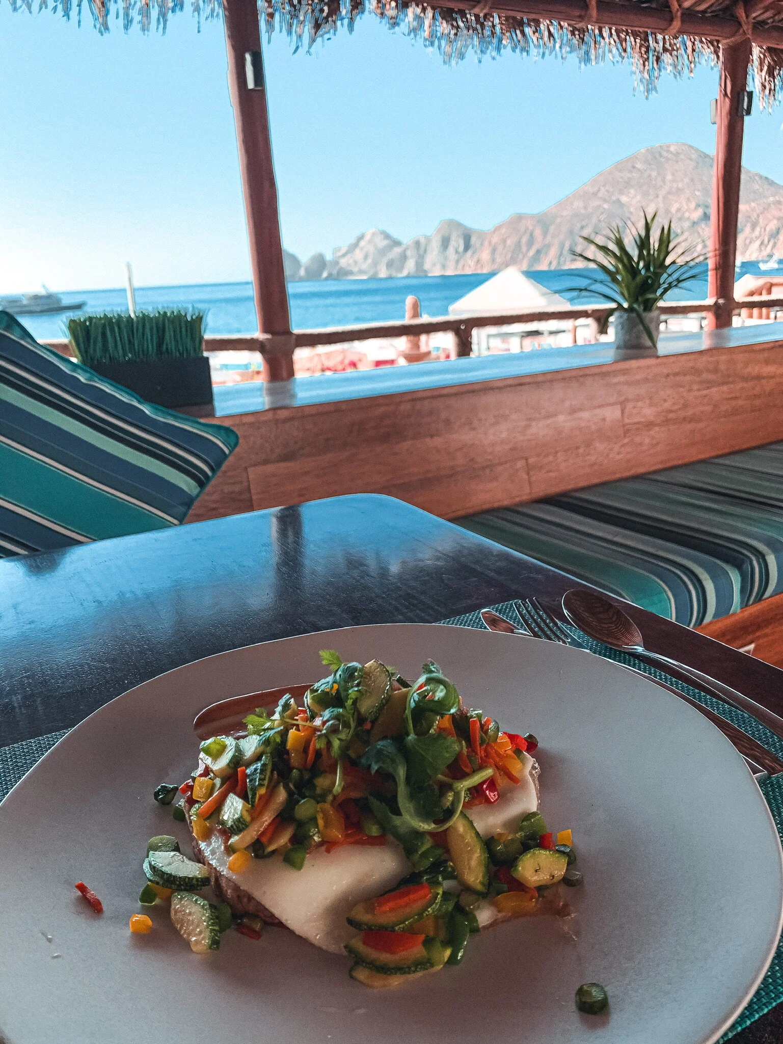 We were so impressed at how both of our experiences out made us feel very safe. but we couldn’t help but feel bad for all the waiters in their protective gear, especially as the temps are rising. Most places in Cabo have not offered plastic straws for awhile, but now plastic was covering all of our silverware, the side plate of bacon we received, even the mimosas had plastic wrap on top. A “solution” for one problem and maybe adding to another?